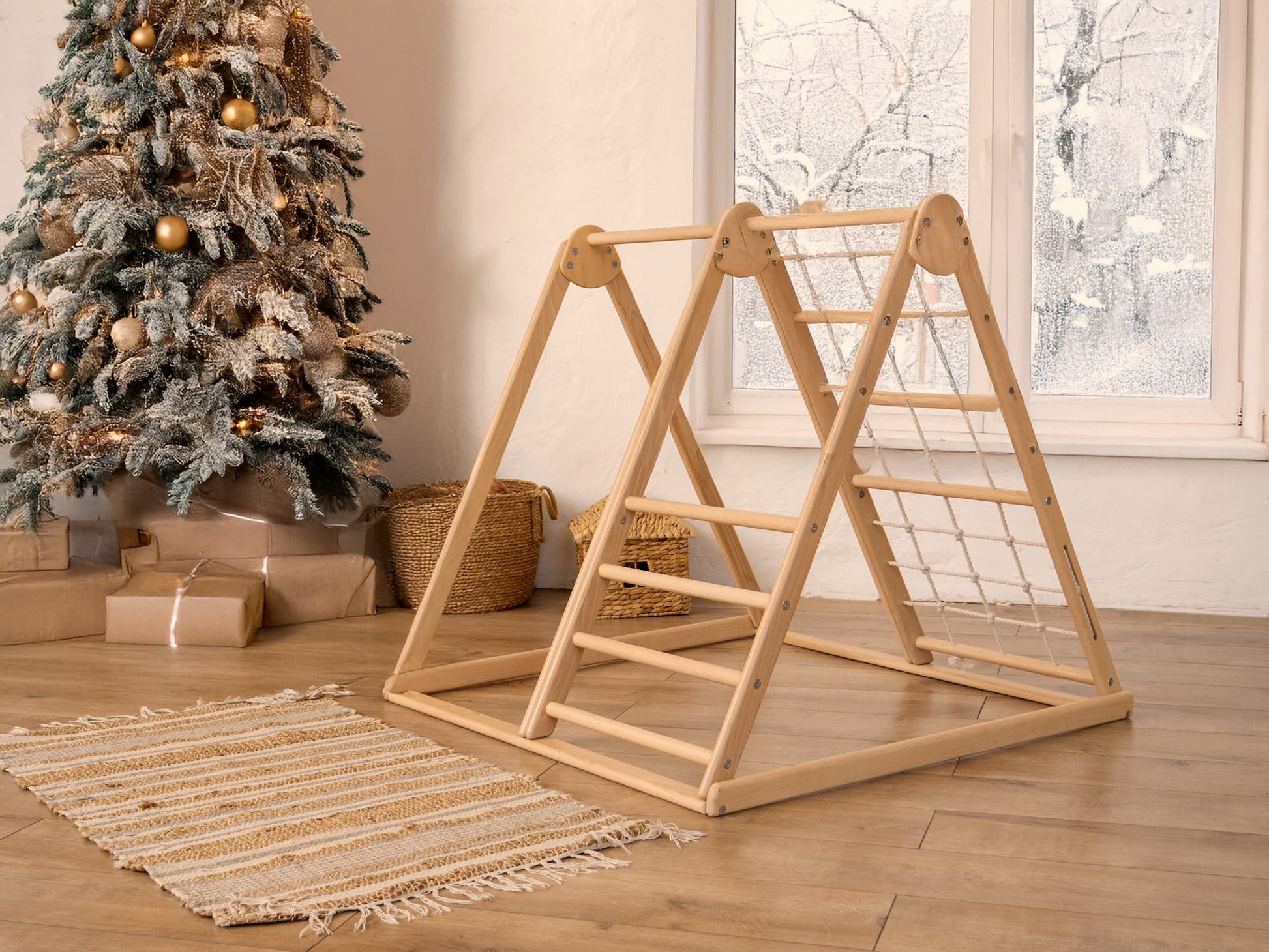 Luonnonpuusta valmistettu pieni kolmion muotoinen kiipeilyteline