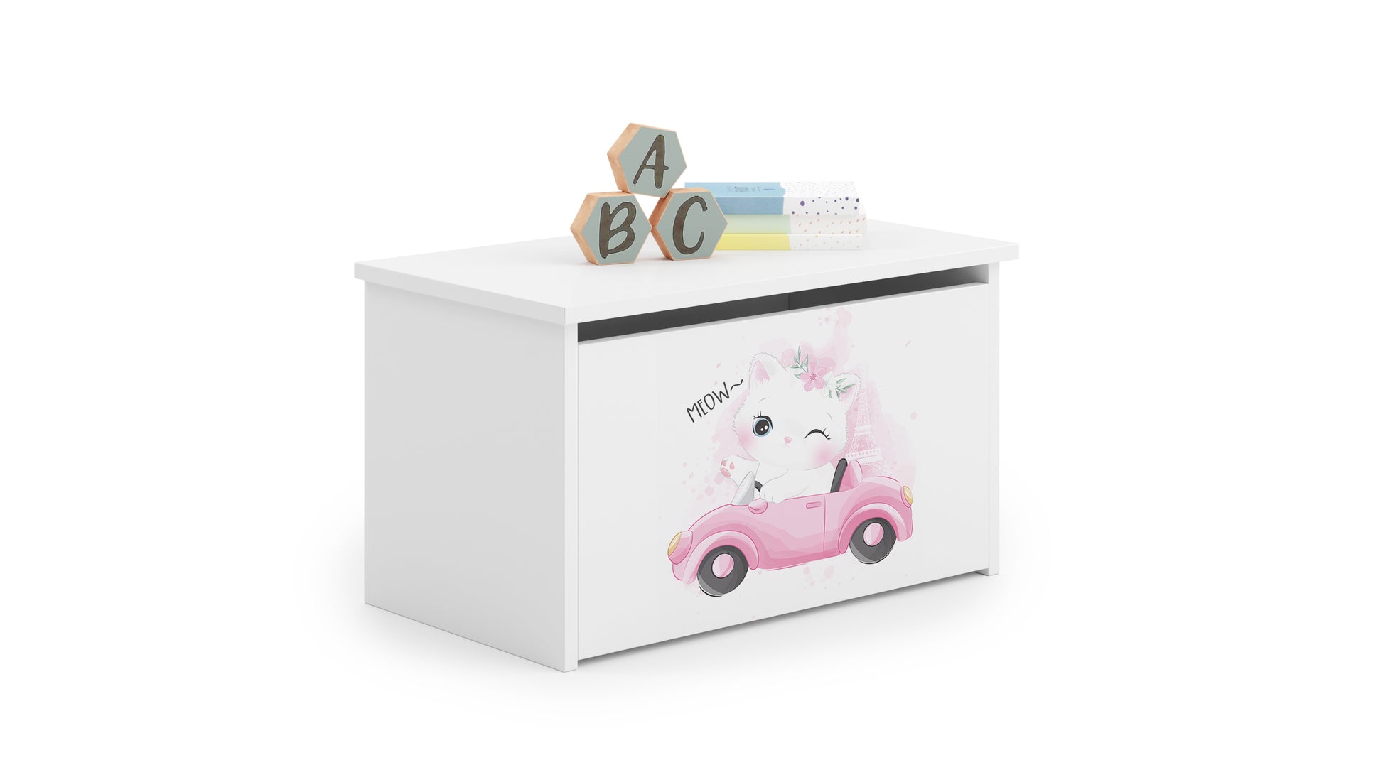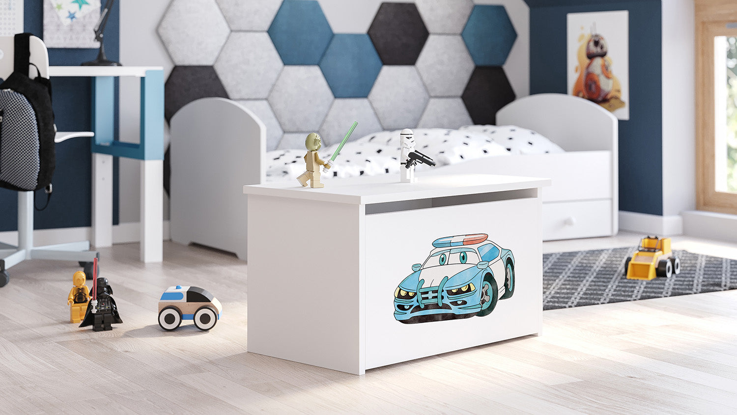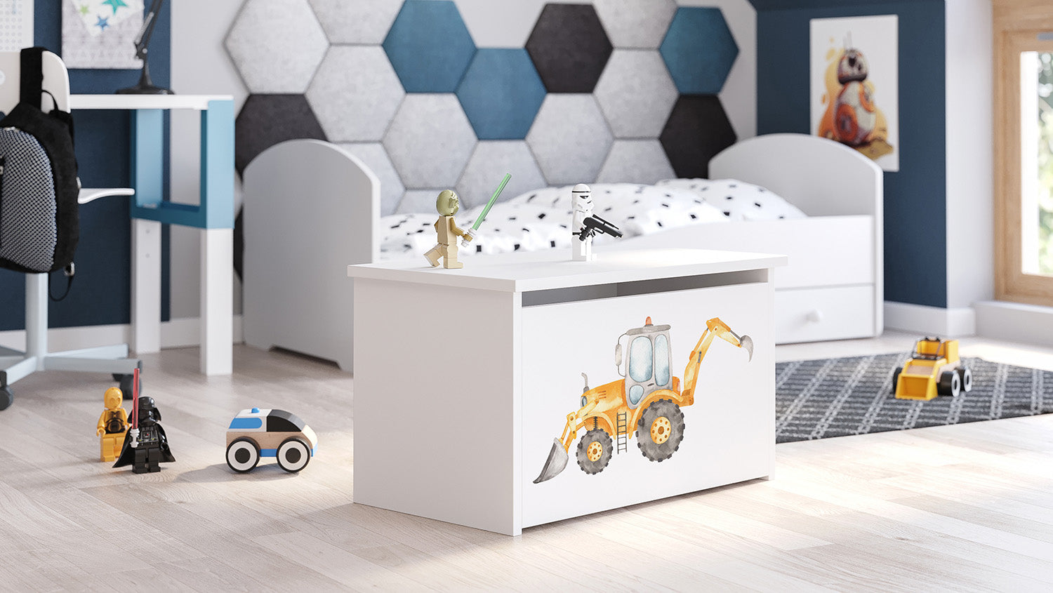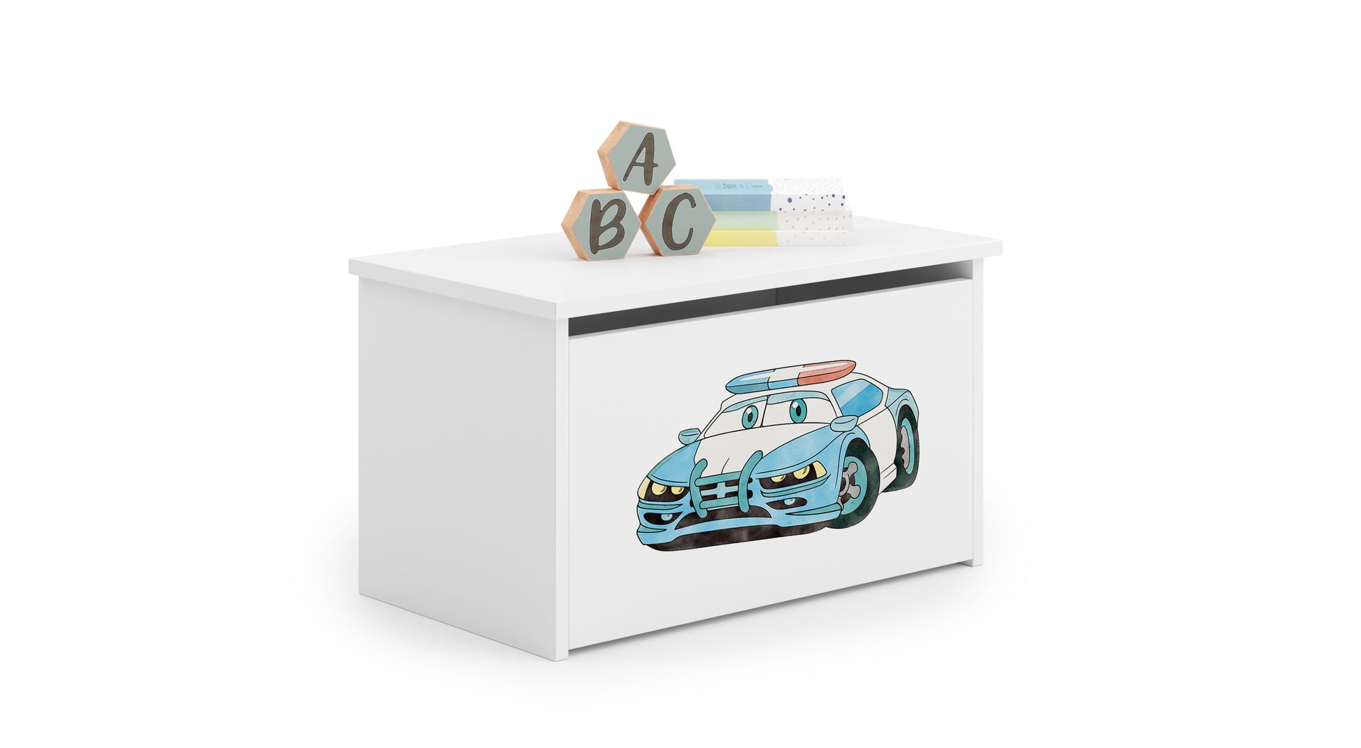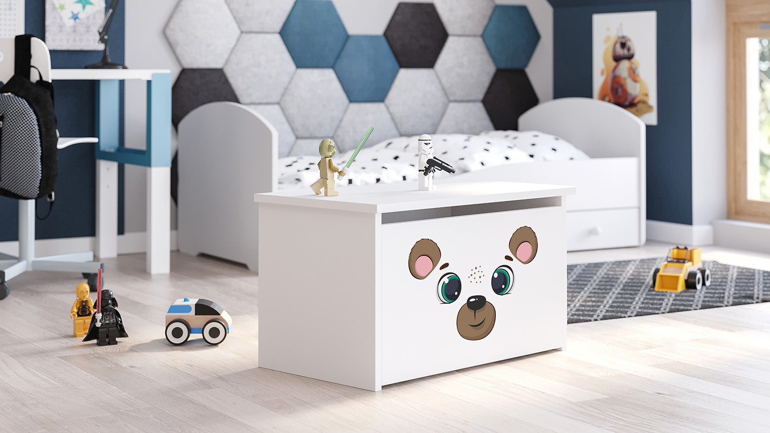 Lelulaatikko on sisältä tilava, johon lapset voivat säilyttää suosikkilelujaan ja muita lasten aarteitaan. Lelulaatikko on valmistettu kalustelevystä, joka on helppokäyttöinen. Laatikko aukea yläpuoli. Kuva painetaan väripainatuksella, joka on kiinnitetty erityisellä laminaatilla, jotta se ei haalistu tai kulu.