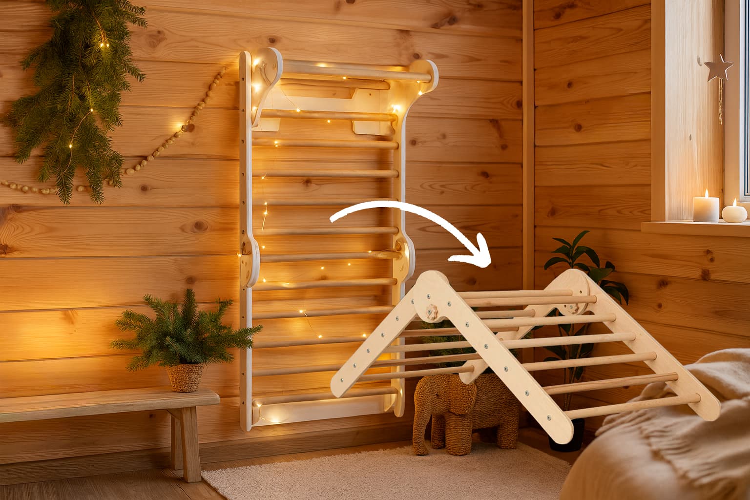 Kolmnurk Transformer 2-in-1 on mitmekülgne ronimisraam, mida saab kasutada nii klassikalise kolmnurgana kui ka Rootsi redeli ehk varbseinana.