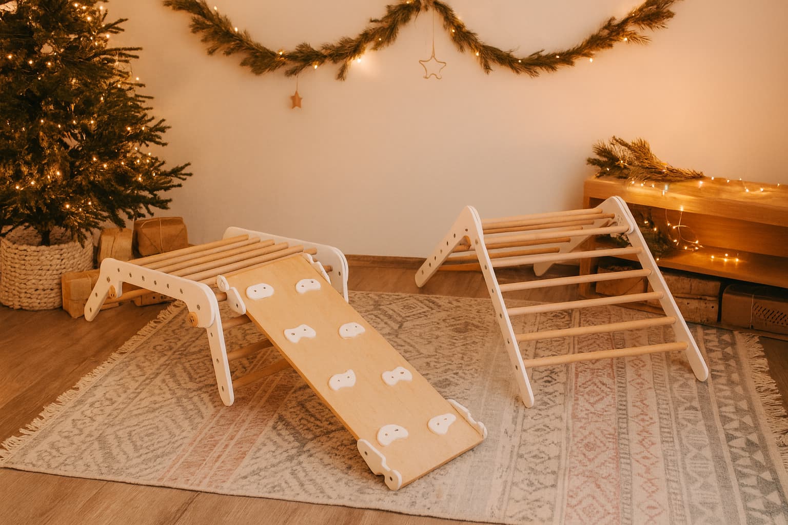 Naturaalses puidutoonis või valge viimistlusega detailid on valmistatud vastupidavast pöögipuidust ning nii kolmnurk kui trapets on kokkupandavad, mis võimaldab komplekti kompaktset hoiustamist. Kolmnurk-ronimisraami saab seinale kinnitada ja kasutada Rootsi redelina.